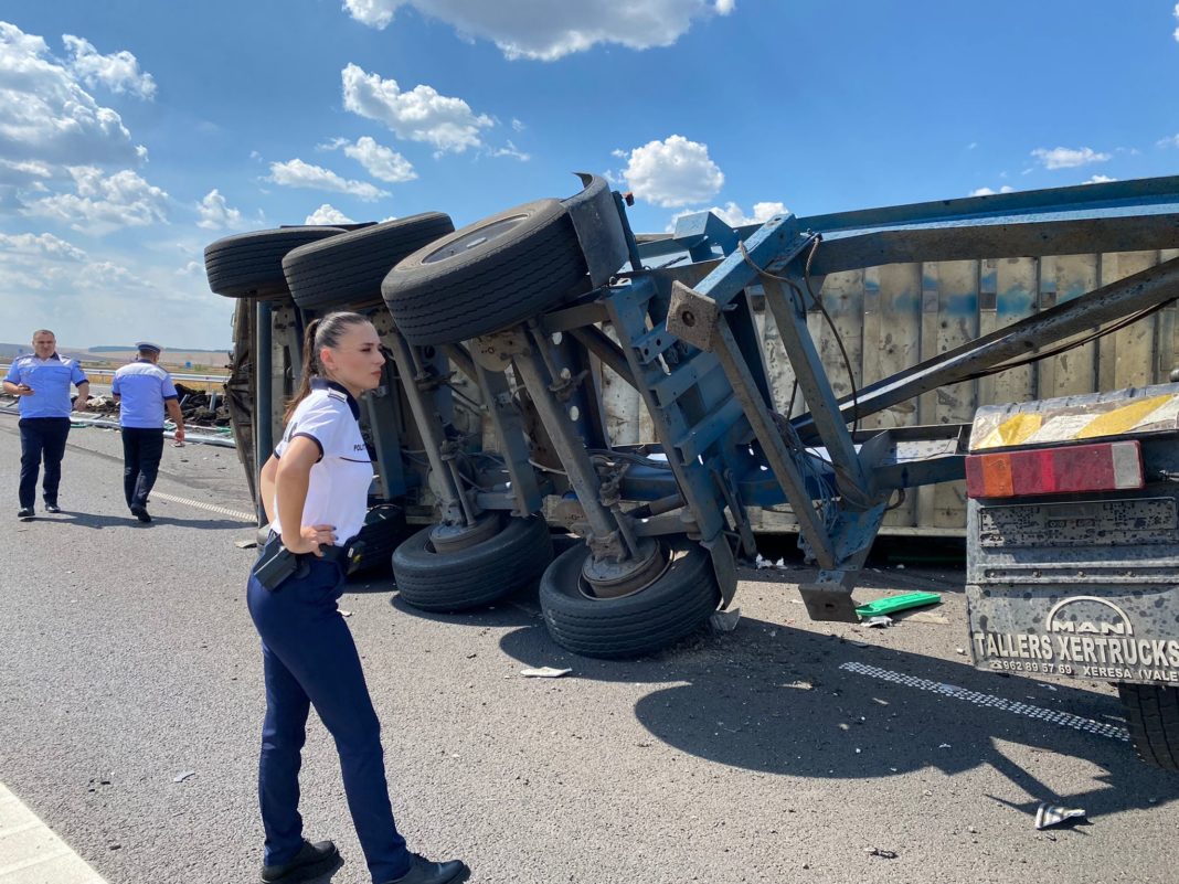 „Nu sunt persoane rănite, însă traficul rutier este blocat pe banda a doua pe ambele sensuri, circulându-se îngreunat pe prima bandă. Se estimează reluarea normală a traficului în 60-90 de minute”, a transmis Poliţia Română.