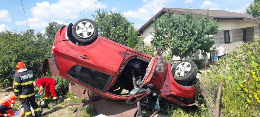Un autoturism condus de un tânăr în vârstă de 18 ani s-a răsturnat peste gardul unei case, sâmbătă, pe un drum din judeţul Giurgiu. Tânărul aflat la volan şi pasagera care călătorea în maşina condusă de el au scăpat cu viaţă, deşi un stâlp metalic a străpuns habitaclul autoturismului, notează News.ro.