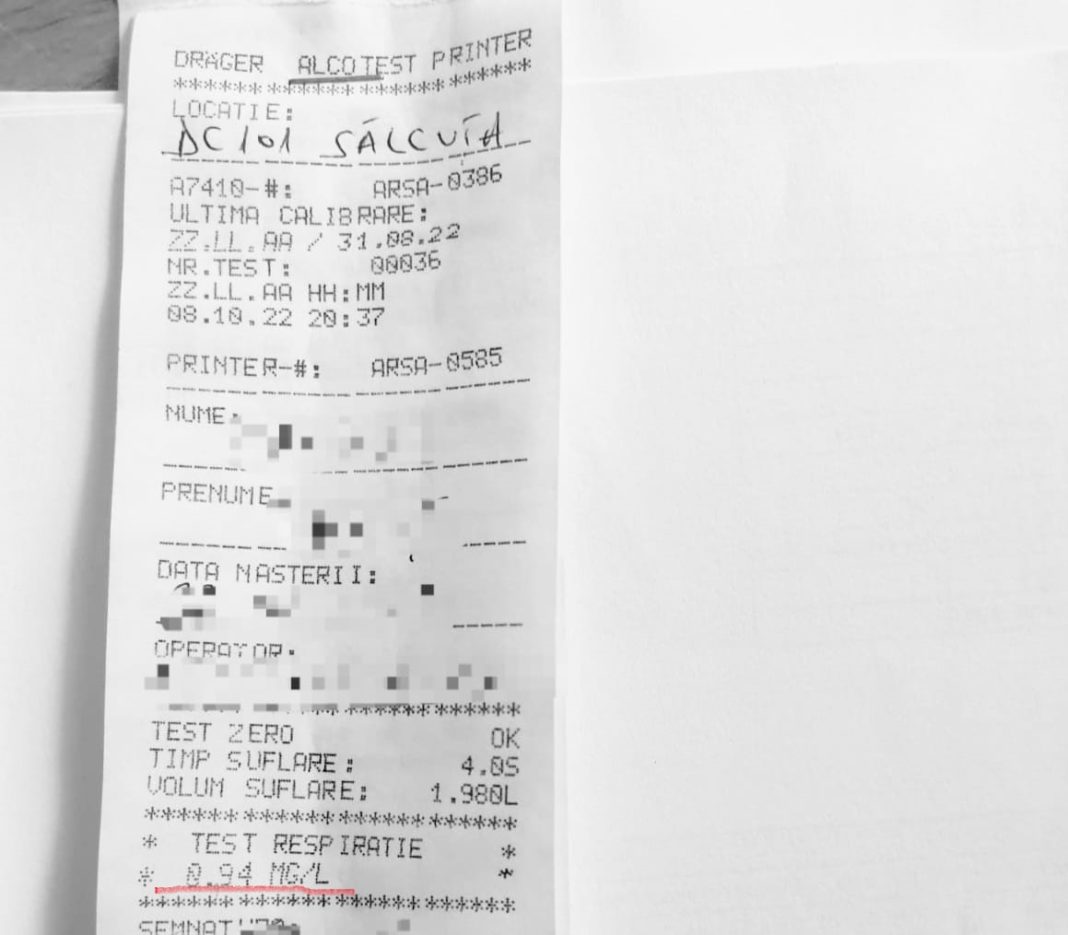 Aparatul alcooltest a indicat o alcoolemie de 0,94 mg/l alcool pur în aerul expirat în cazul bărbatului de 60 de ani. Acesta a refuzat recoltarea de probe biologice pentru stabilirea alcoolemiei.
