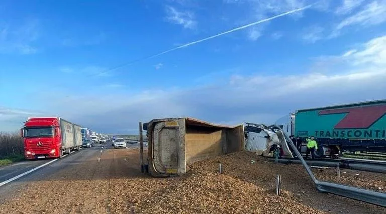 ”Pe autostrada A1 Bucureşti-Piteşti, la kilometrul 53, în zona localităţii Corbii Mari, judeţul Dâmboviţa, un TIR încărcat cu nisip s-a răsturnat pe partea carosabilă, blocând benzile 1 şi 2 de pe ambele sensuri de mers”, anunţă Centrul INFOTRAFIC din Inspectoratul General al Poliţiei Române.