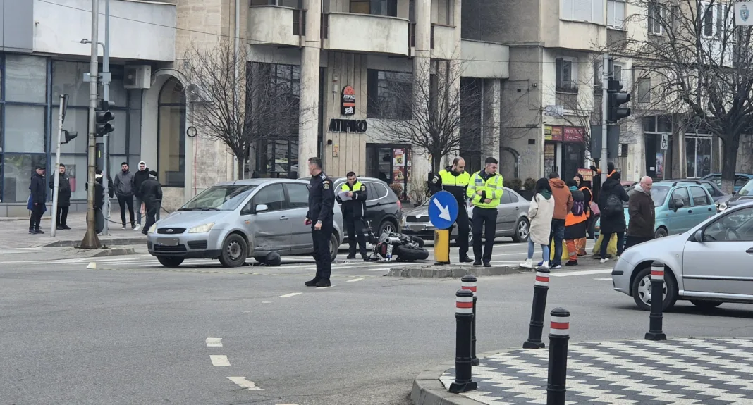 Impact între o motocicletă şi un autoturism în centrul Craiovei