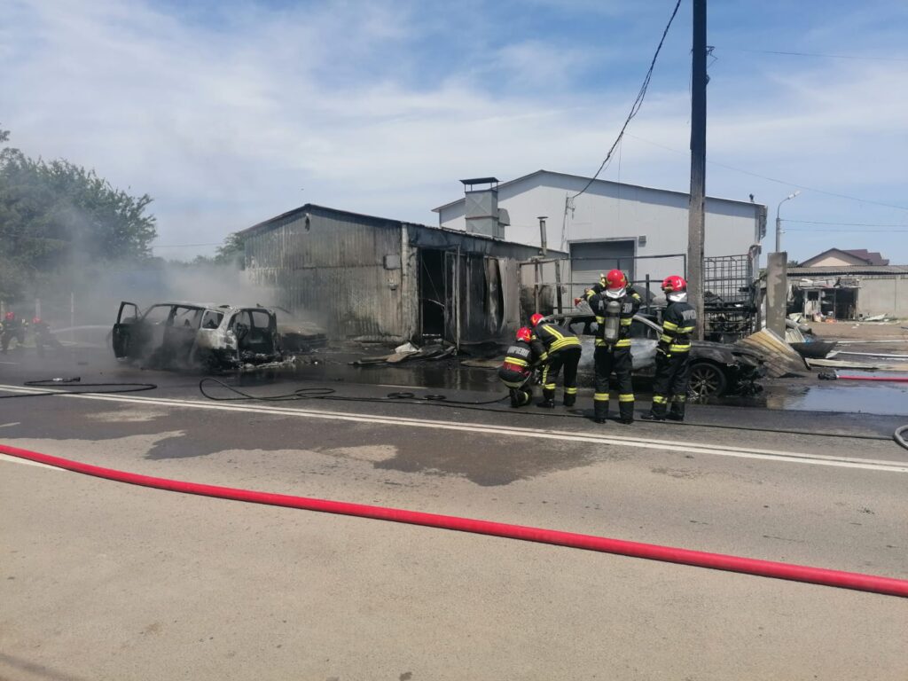 Incendiul a izbucnit în curtea service-ului auto situat pe Şoseaua Focşani din municipiul Brăila şi s-a extins la mai multe autoturisme aflate în apropiere.