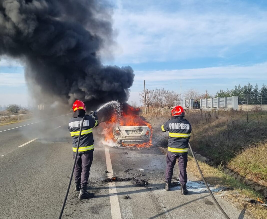 Pompierii doljeni au intervenit, astăzi, pentru stingerea unui incendiu care a cuprins un autoturism, pe Centura de Nord, zona Tancodrom.