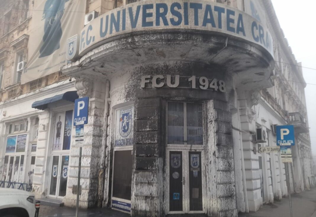 „În dimineaţa zilei de 9 martie, în jurul orei 5.00, polițiști din cadrul Secției 1 Poliție Craiova s-au sesizat din oficiu cu privire la faptul că, pe peretele exterior și pe ușa de acces în magazinul oficial al unui club sportiv din Craiova, persoane necunoscute au aruncat cu o substanță lichidă de culoare neagră. În cauză se efectuează cercetări pentru stabilirea cu exactitate a împrejurărilor în care a avut loc evenimentul, identificarea autorilor și luarea măsurilor legale”, au transmis oamenii legii.