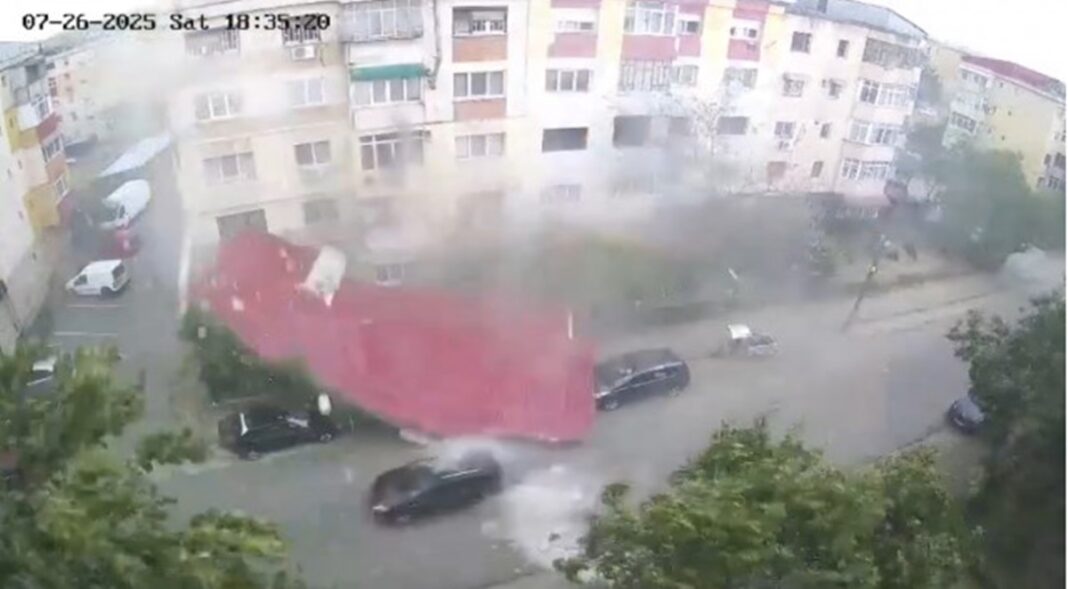 VIDEO / Momentul în care acoperişul unui bloc e smuls de furtună şi se prăbuşeşte peste o persoană