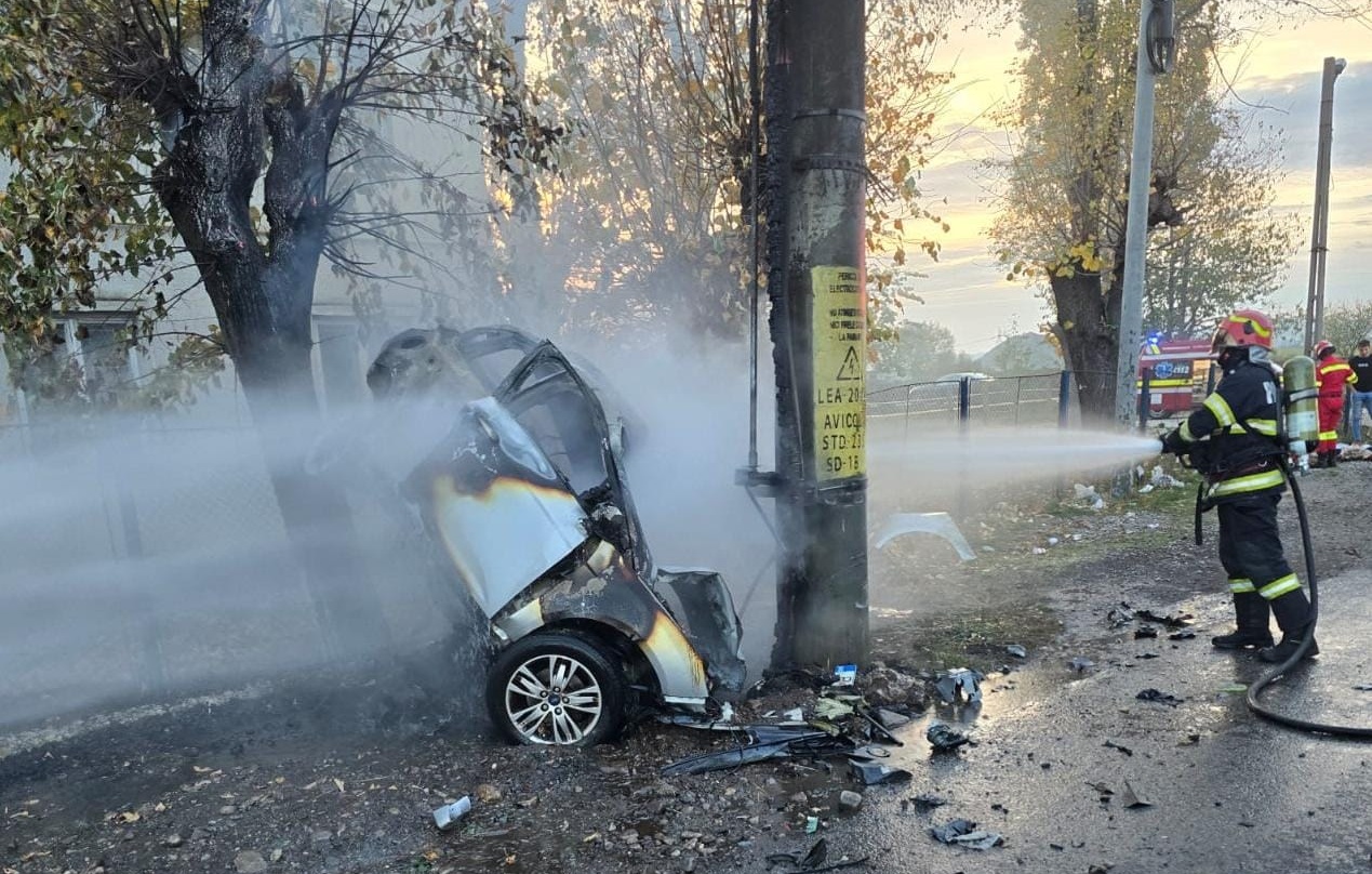 Accidentul, în care a fost implicată o singură mașină, a fost urmat de un incendiu.