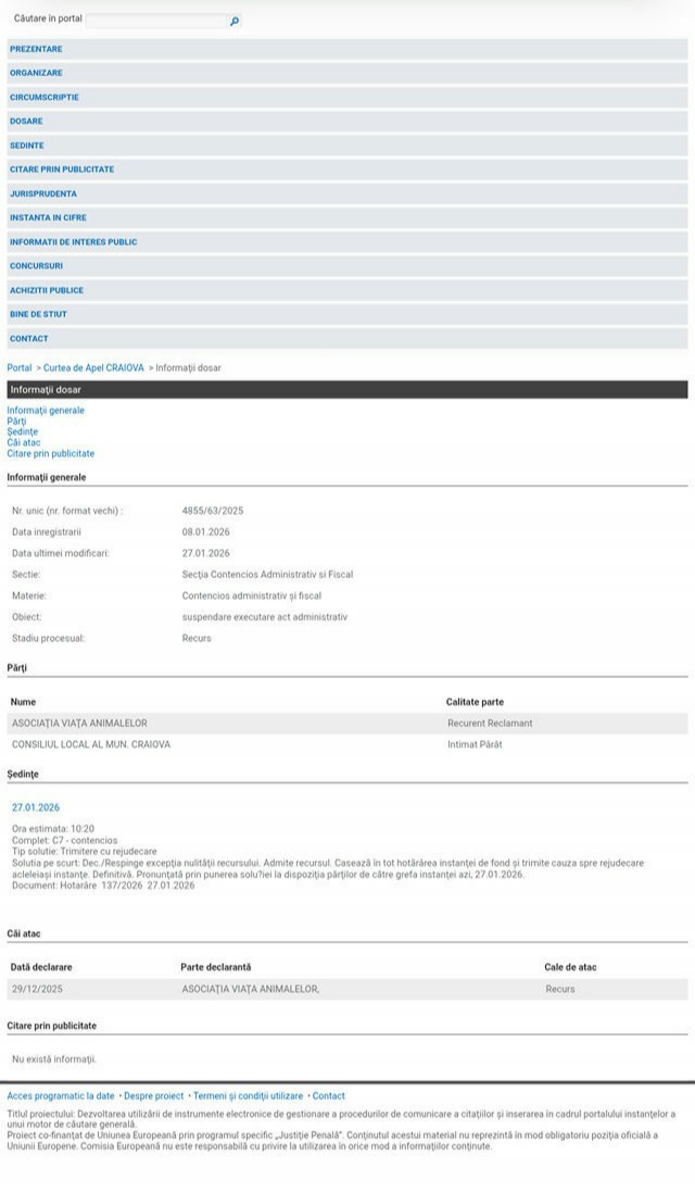 De această dată în dosar părțile sunt: Asociația Viața animalelor și Consiliul Local al Municipiului Craiova.