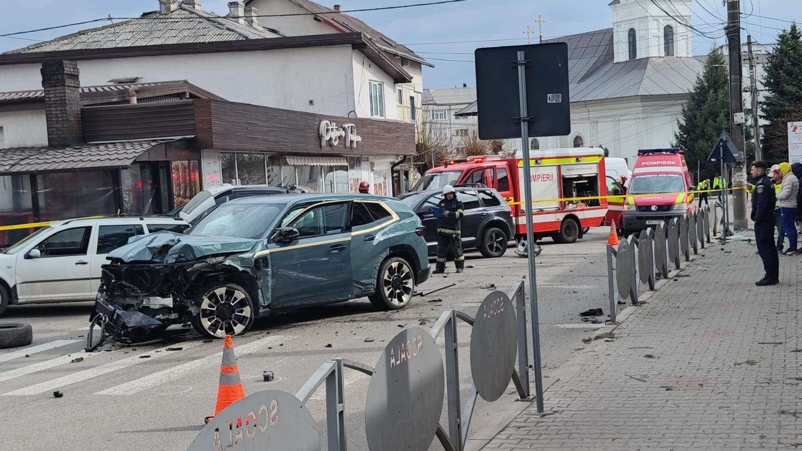 Doi pietoni și două persoane aflate într-o mașină parcată, răniți după ce un șofer a pierdut controlul mașinii într-o curbă