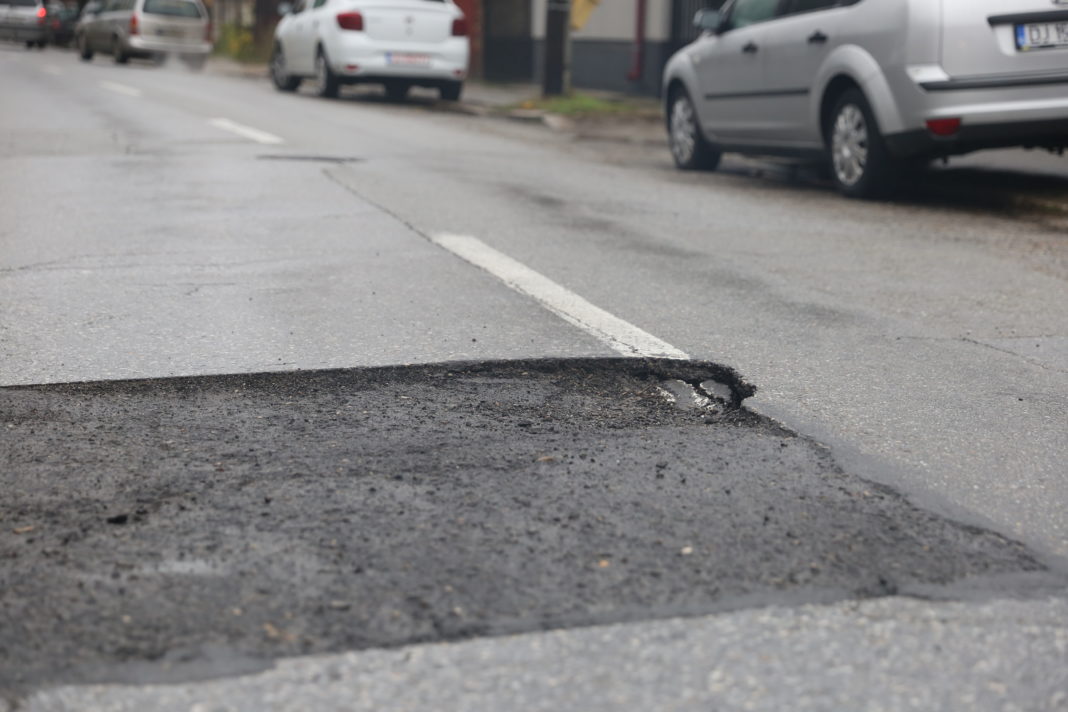 Mixtura asfaltică a început să se descompună şi pământul de dedesubt să se lase. Prin urmare, şi-a făcut apariţia o groapă, care începe să se întindă de-a latul străzii. Atâta timp cât pe ambele părţi ale carosabilului sunt parcate autoturisme, groapa cu pricina este greu de ocolit. Câţiva metri mai departe, o altă „cârpeală“ dă şi ea semne că s-ar prăbuşi. Este vorba tot despre o intervenţie a CAO, făcută aici în vara acestui an. Au reparat, au asfaltat, iar acum în acel loc covorul asfaltic începe să se lase.