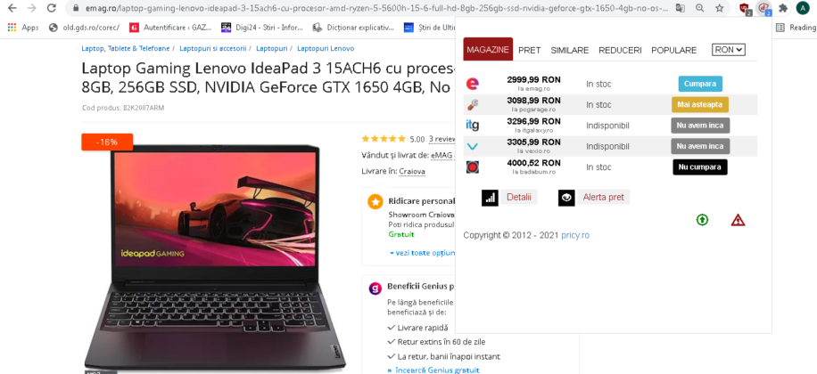 După ce ai trecut prin toţi aceşti paşi, pe orice site vei intra să îţi cumperi un anumit produs, îţi va apărea extensia Pricy mereu, în bara Google din dreapta sus. Dacă vei da click pe aceasta, vei putea vedea pe ce site-uri mai este disponibil produsul dorit şi la ce preţ. Însă, de departe cel mai mare avantaj al acestei extensii este acela că poţi vedea evoluţia preţului produsului respectiv pe trei luni, şase luni, ba chiar şi pe un an şi doi ani.