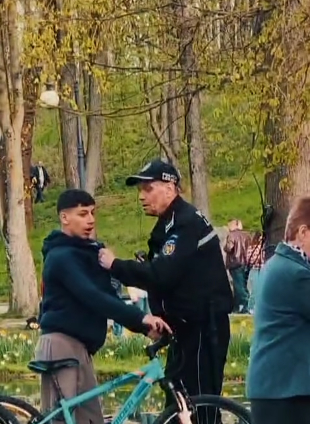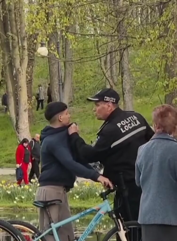 Primul caz, surprins și distribuit pe rețelele de socializare, arată un polițist local care intervine agresiv asupra unui adolescent aflat cu bicicleta pe o alee din Parcul Romanescu. În imagini se observă cum agentul îl apucă pe tânăr de gât și îl bruschează, în timp ce îi adresează reproșuri. Deși nu este clar ce regulă ar fi încălcat minorul, reacția polițistului a fost considerată de mulți drept disproporționată.