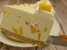 Tort fără coacere cu biscuiți, iaurt și piersici